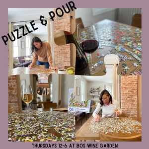 Thursdays are for puzzling here at BOS Wine Garden. Come visit us and unwind with a glass of wine while putting together a puzzle. We'll have a variety of puzzles available (you are also welcome to bring your own if you prefer) --work on one collaboratively or tackle one by yourself. As usual, we'll have a lovely selection of wine by the glass for you to enjoy. We can't wait to see you!